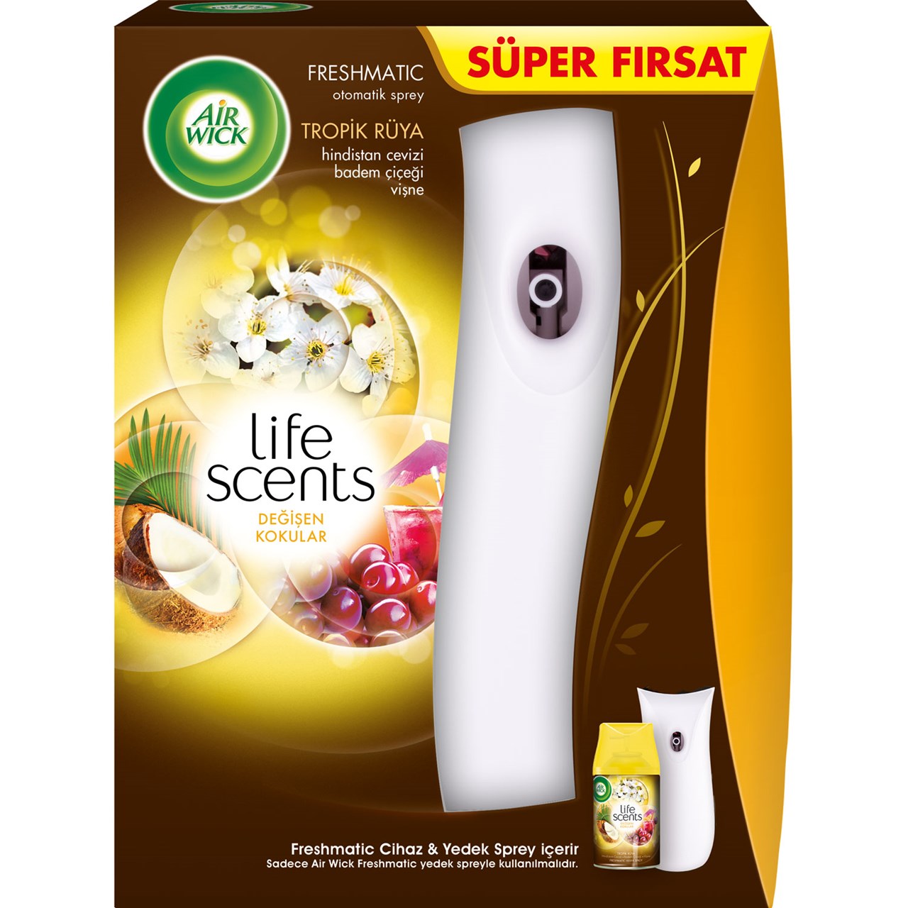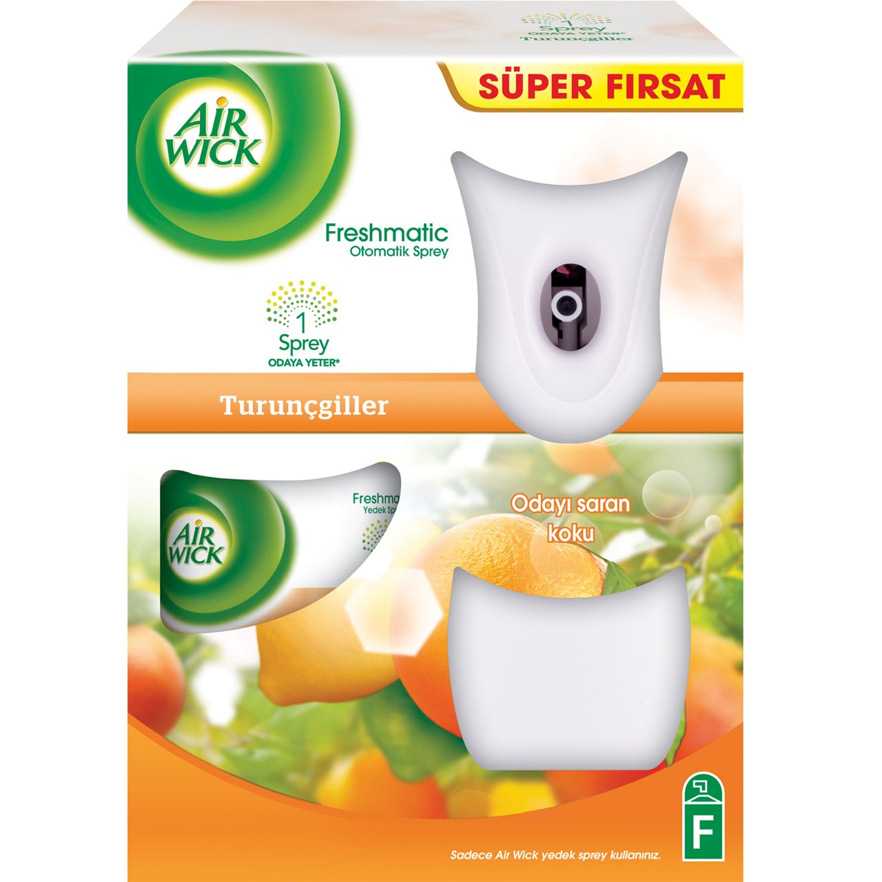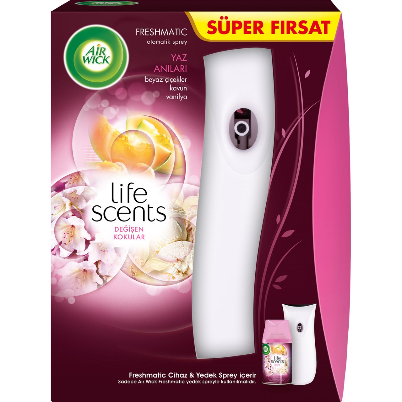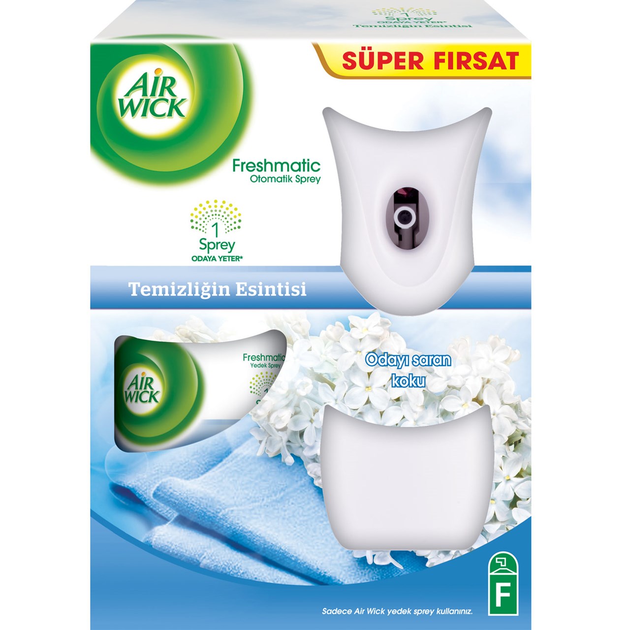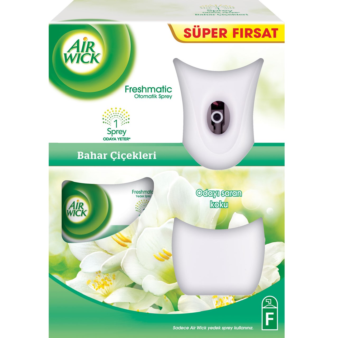Air Wick Freshmatic kit; 1 adet otomatik cihaz, 1 adet yedek sprey ve 2 adet AA/LR6 pil içerir.